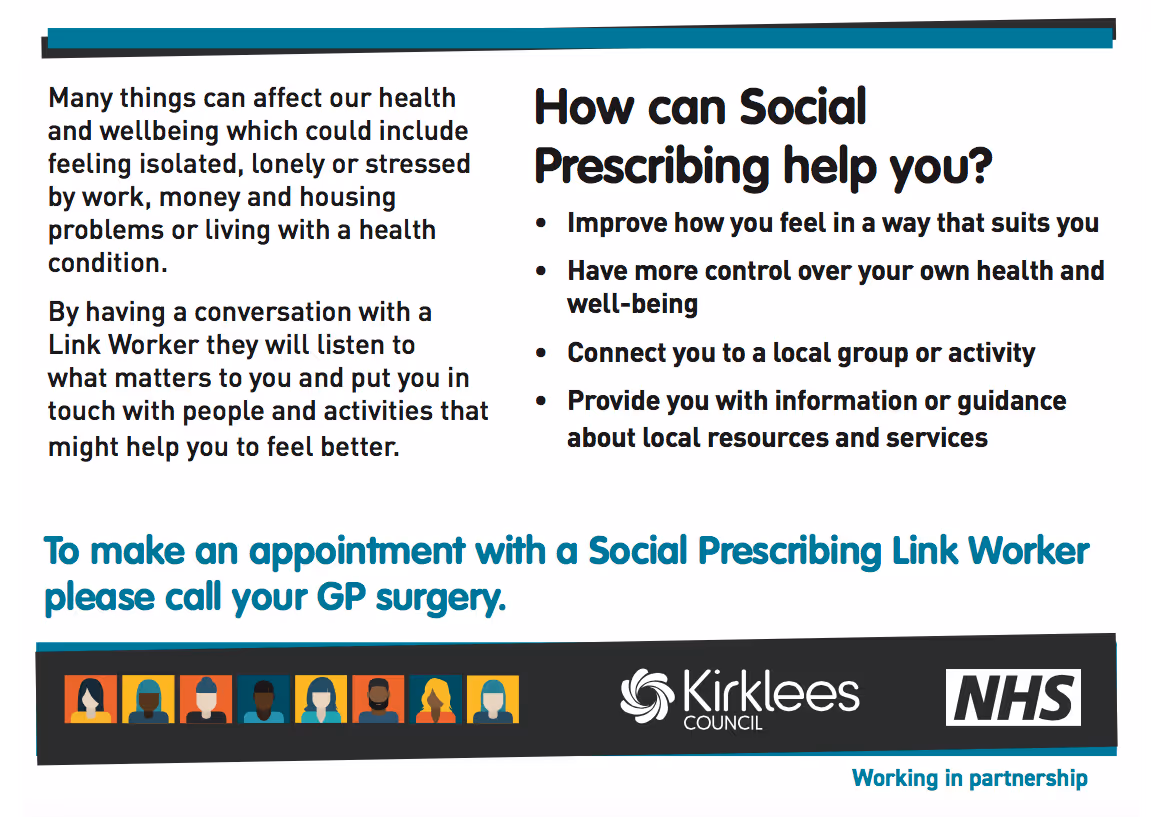 Did you know we offer Social Prescribing? Many things can affect our health and well-being which could include feeling isolated, lonely or stressed by work, money, housing problems or living with a health condition. Social Prescribing can connect you to a range of activities, service and events in your local community that might help you to feel better. To make an appointment with a Social Prescribing Link Worker please call your GP surgery.